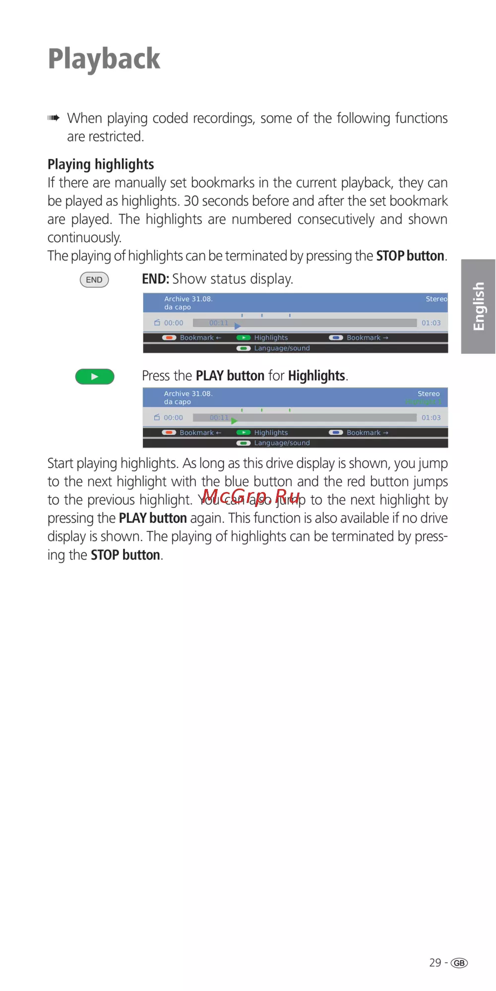 - Highlight wiedergabe sind manuelle lesezeichen in der laufenden wiedergabe gesetzt können sie diese als highlights wiedergeben lassen hierbei wird je weils 30 sekunden vor und nach dem lesezeichen wiedergegeben die highlights werden in der zeitlichen folge durchnummeriert und fortlaufend dargestellt die highlight wiedergabe können sie mit der stop taste beenden end statusanzeige einblenden p.11