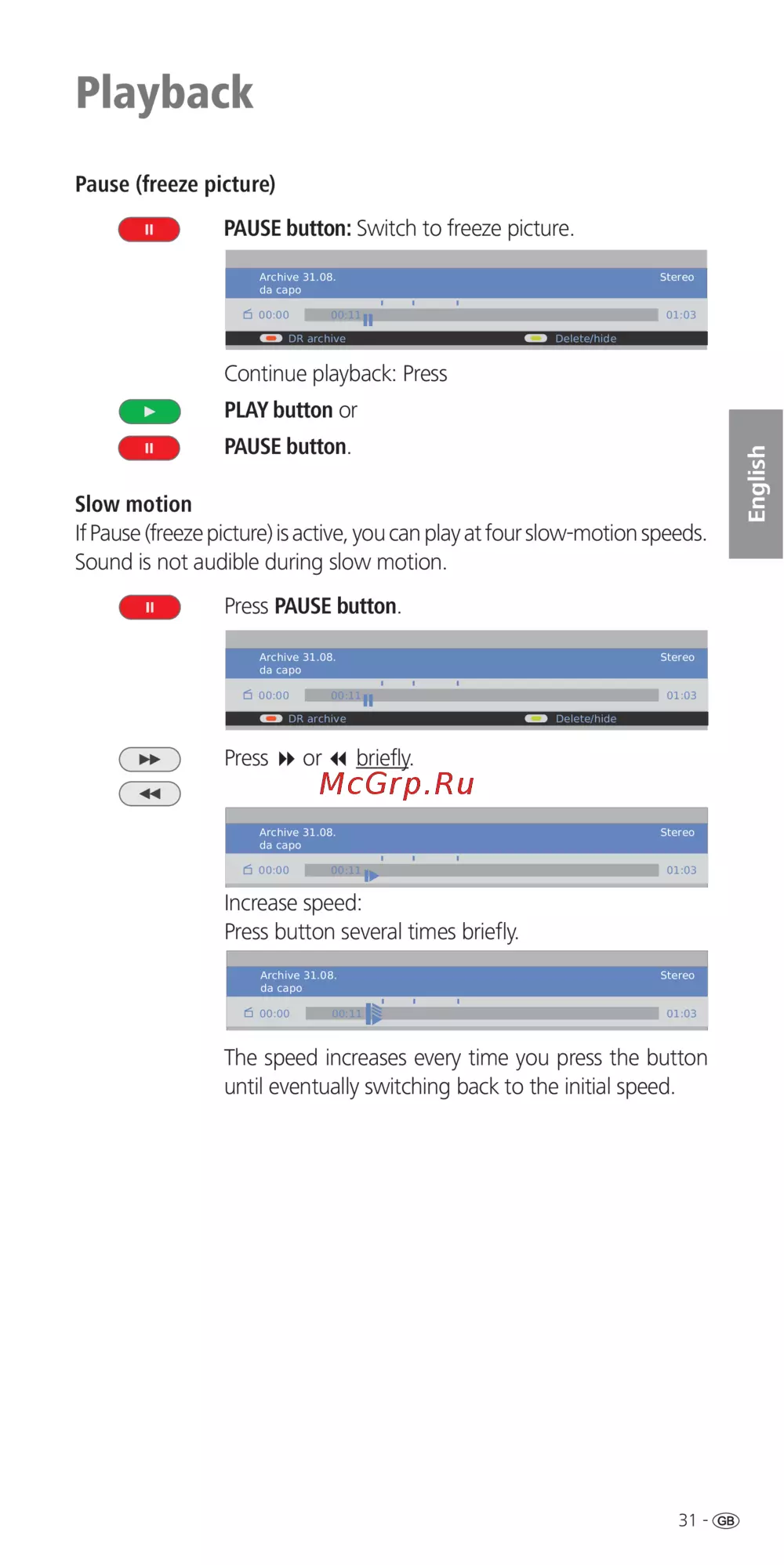 - Schnelles vor und rückspulen während einer archiv wiedergabe können sie in drei verschiedenen geschwindigkeiten vor und zurückspulen bei hdtv aufzeichnungen ist rückspulen nicht möglich während des spulens ist kein ton hörbar p.12