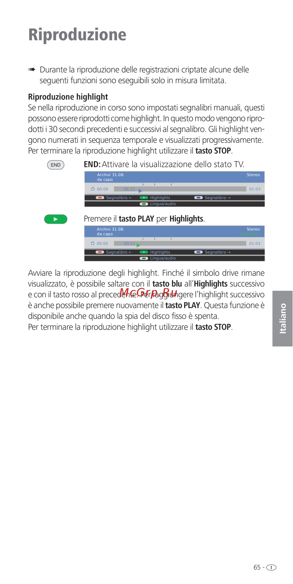 - Die wiedergabe der highlights startet solange diese laufwerkanzeige eingeblendet ist springen sie mit der blauen taste zum nächsten mit der roten taste zum vorherigen highlight zum nächsten highlight gelangen sie auch indem sie erneut die play taste drücken diese funktion steht auch zur verfügung wenn keine laufwerkanzeige eingeblendet ist mit der stop taste beenden sie die highlight wiedergabe p.11