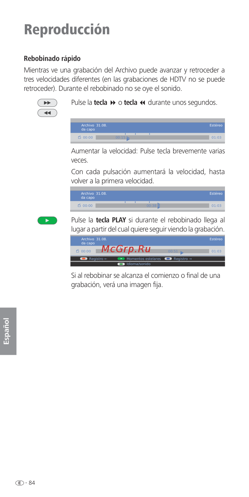 retroceder). Durante el rebobinado no se oye el sonido.