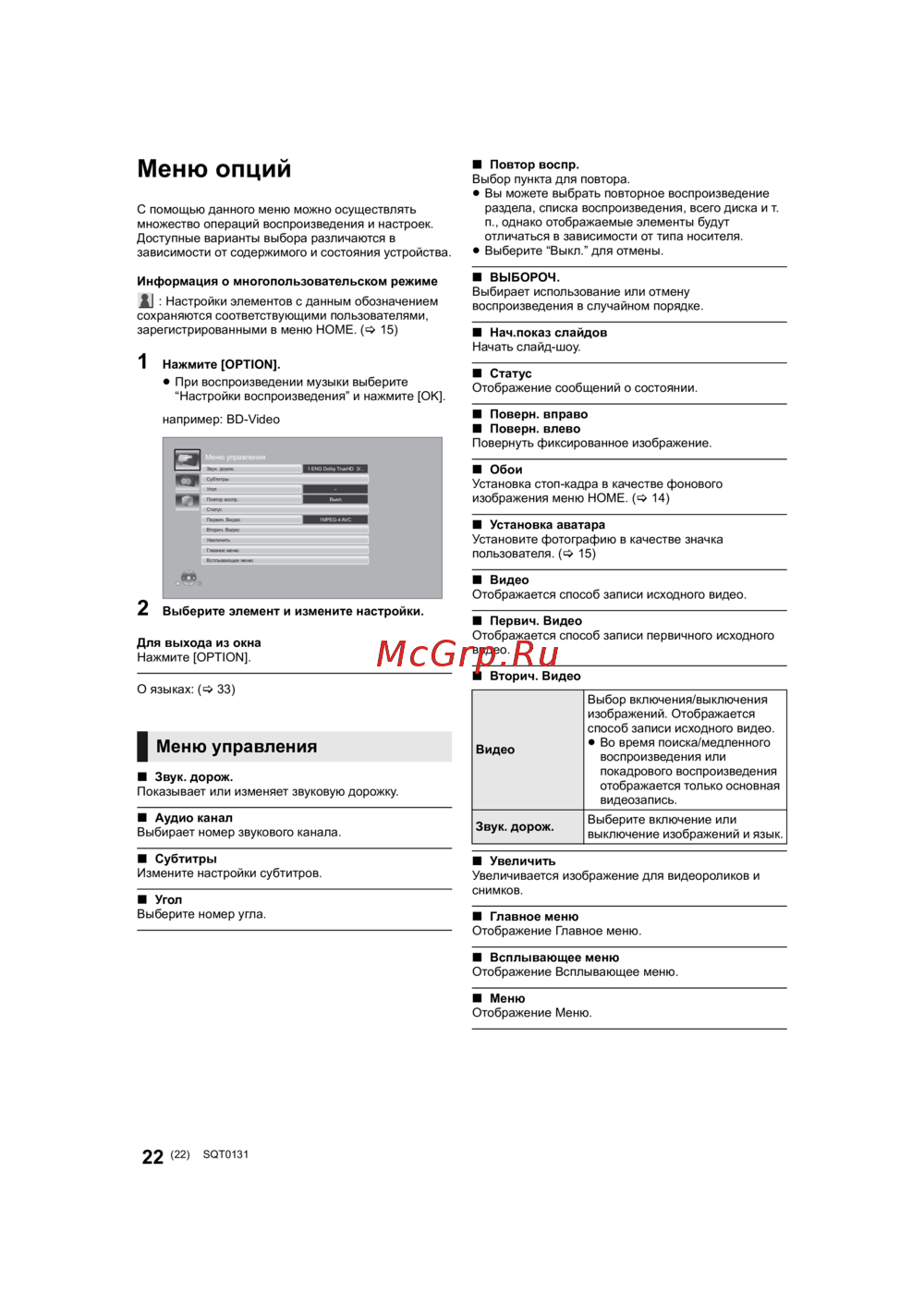 Узнайте, как использовать меню опций для настройки воспроизведения, звука и субтитров. Оптимизируйте свой опыт с мультимедийными устройствами.