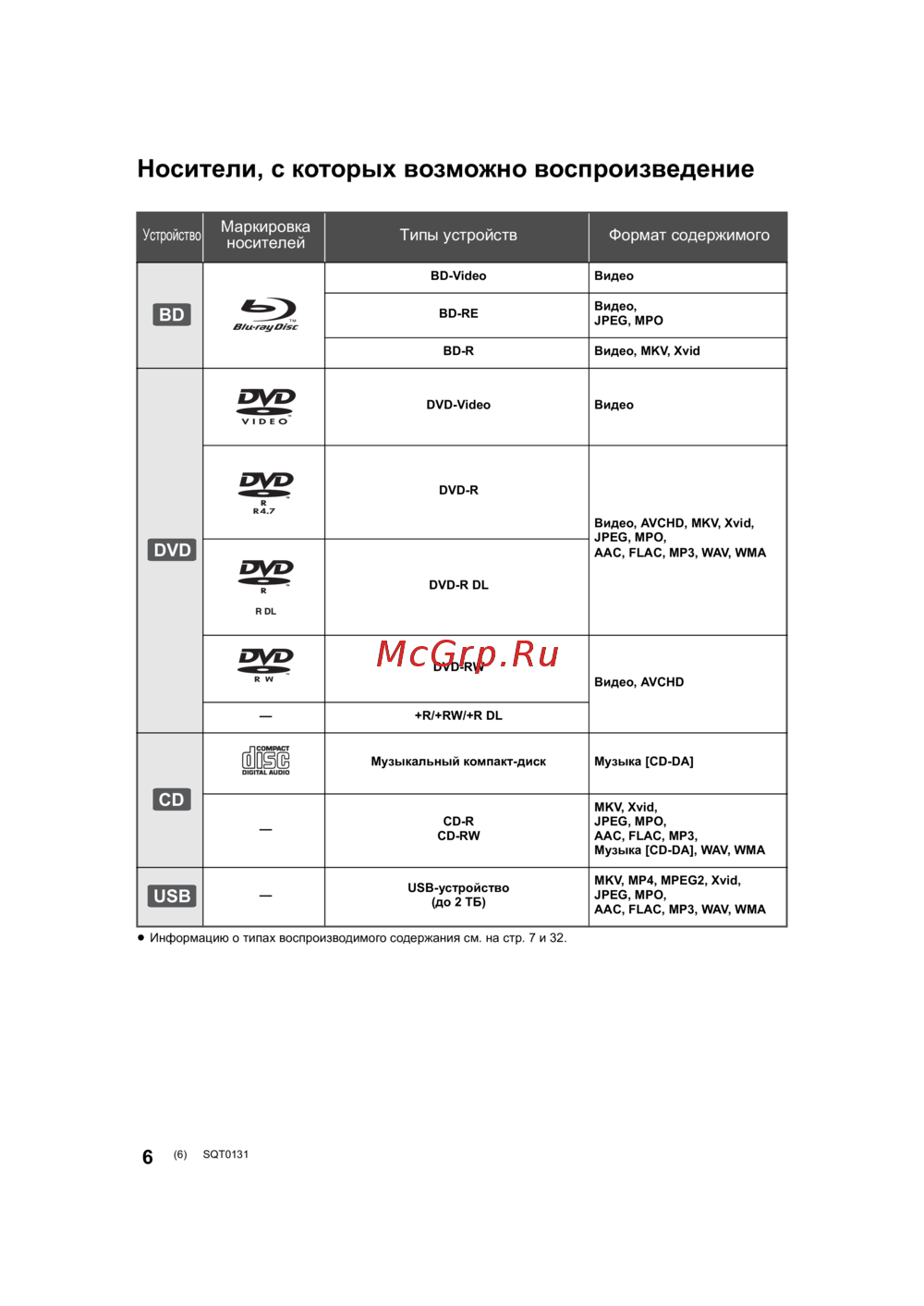 Panasonic DMP-BDT460 [6/72] Носители с которых возможно воспроизведение
