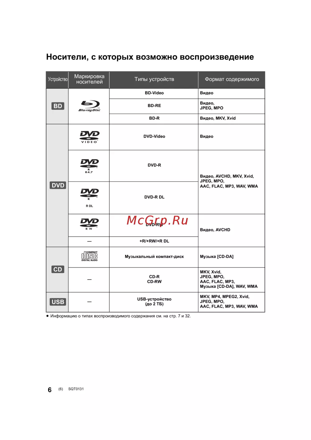 ≥ Информацию о типах воспроизводимого содержания см. на стр. 7 и 32.