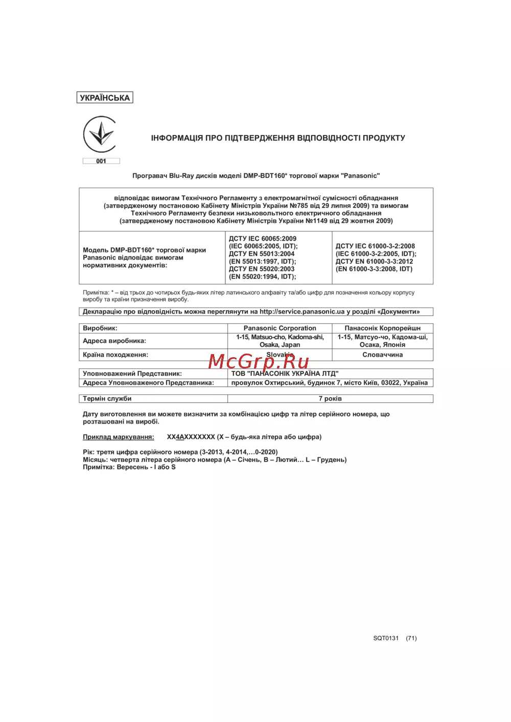 Panasonic DMP-BDT460 [71/72] Інформація про підтвердження відповідності продукту