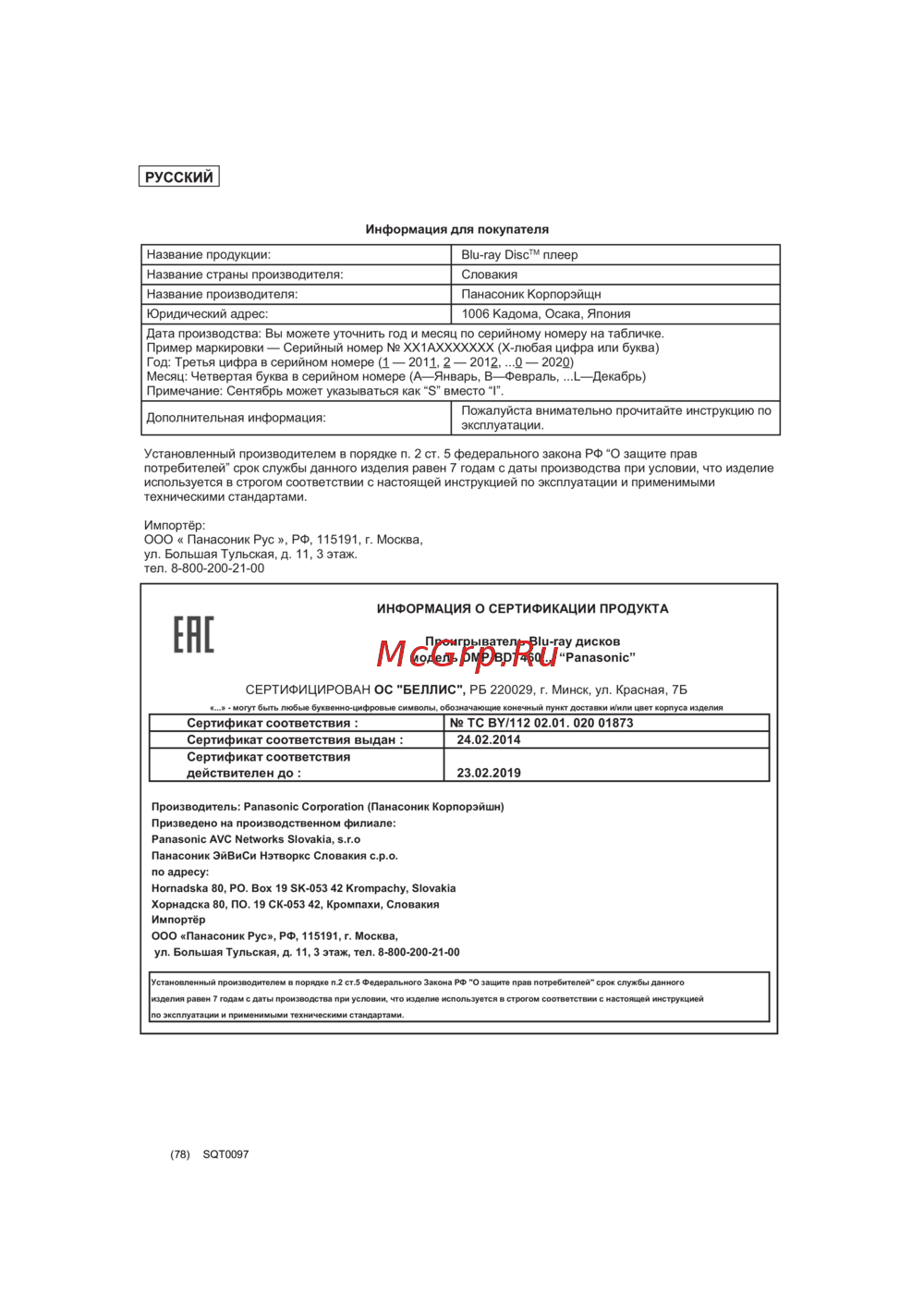 ![Panasonic DMP-BDT460 Silver [78/80] Сертифицирован ос беллис рб 220029 г минск ул красная 7б](/views2/1209961/page78/bg4e.png)