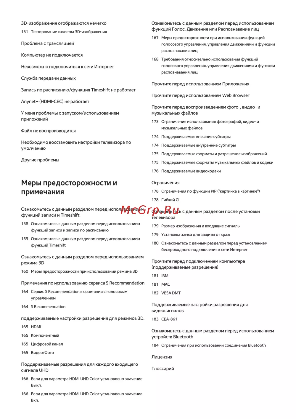 - Если выбрать разрешение не указанное в таблицах это может привести к тому что на экране телевизора не будет изображения или будет включен только индикатор питания p.187