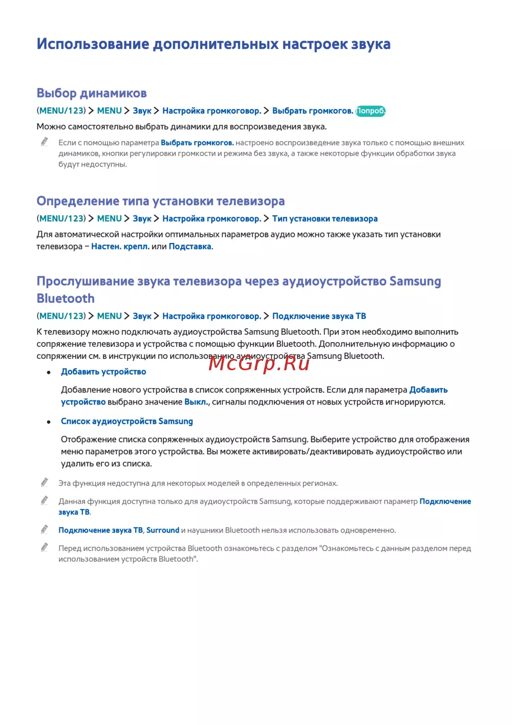 Подключение звука ТВ, Surround и наушники Bluetooth нельзя использовать одновременно.