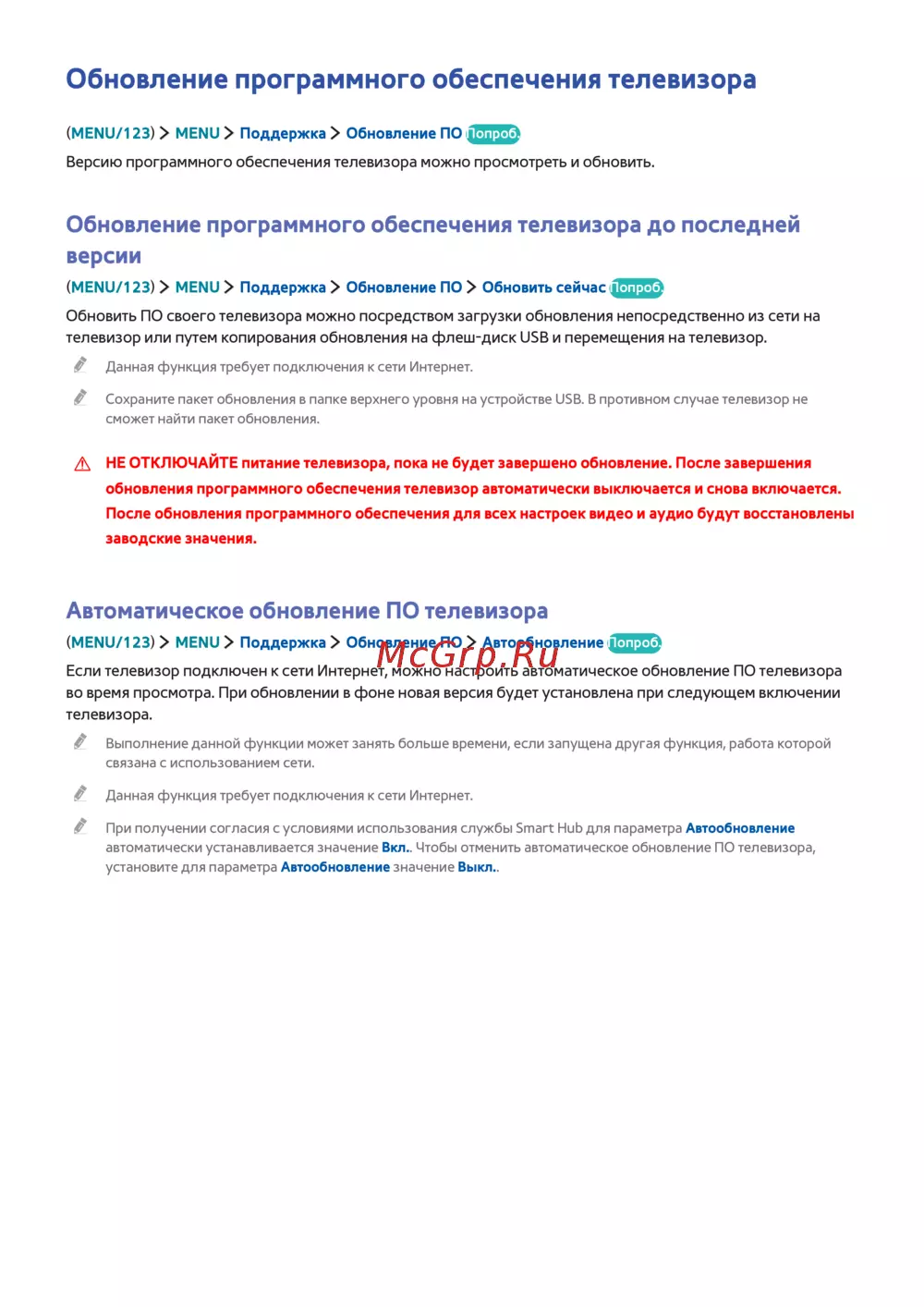 (MENU/123) MENU Поддержка Обновление ПО Автообновление