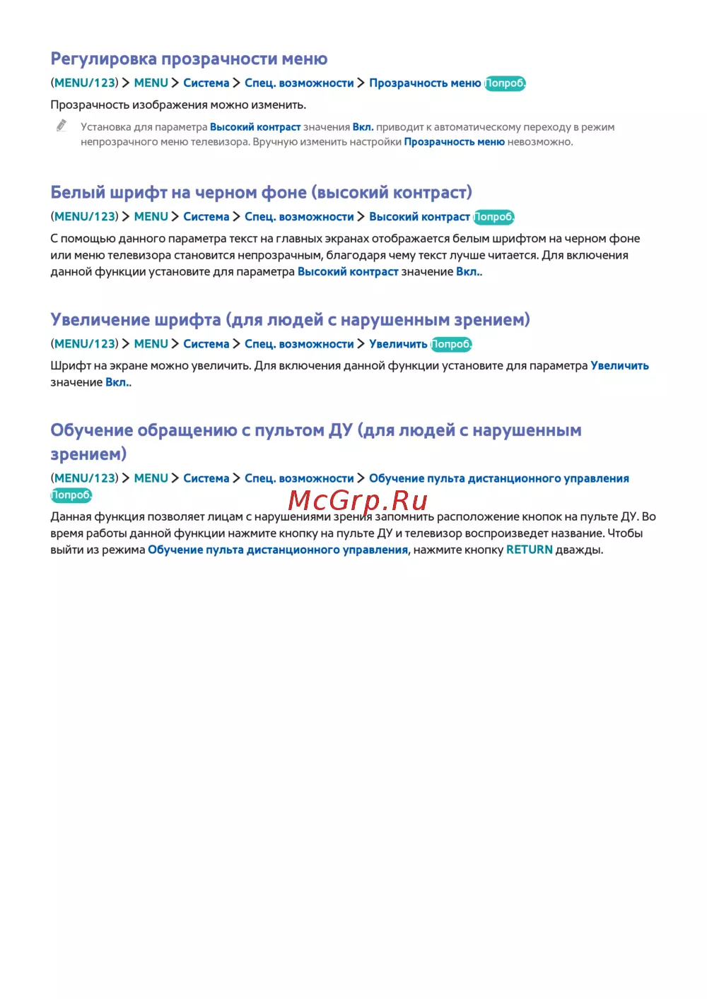 Данная функция позволяет лицам с нарушениями зрения запомнить расположение кнопок на пульте ДУ. Во