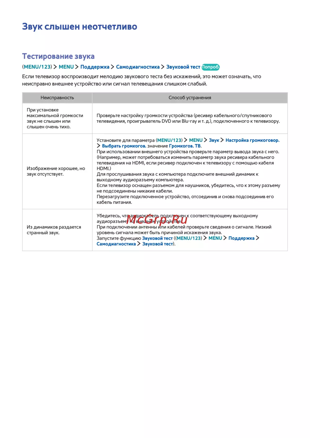 Если телевизор воспроизводит мелодию звукового теста без искажений, это может означать, что