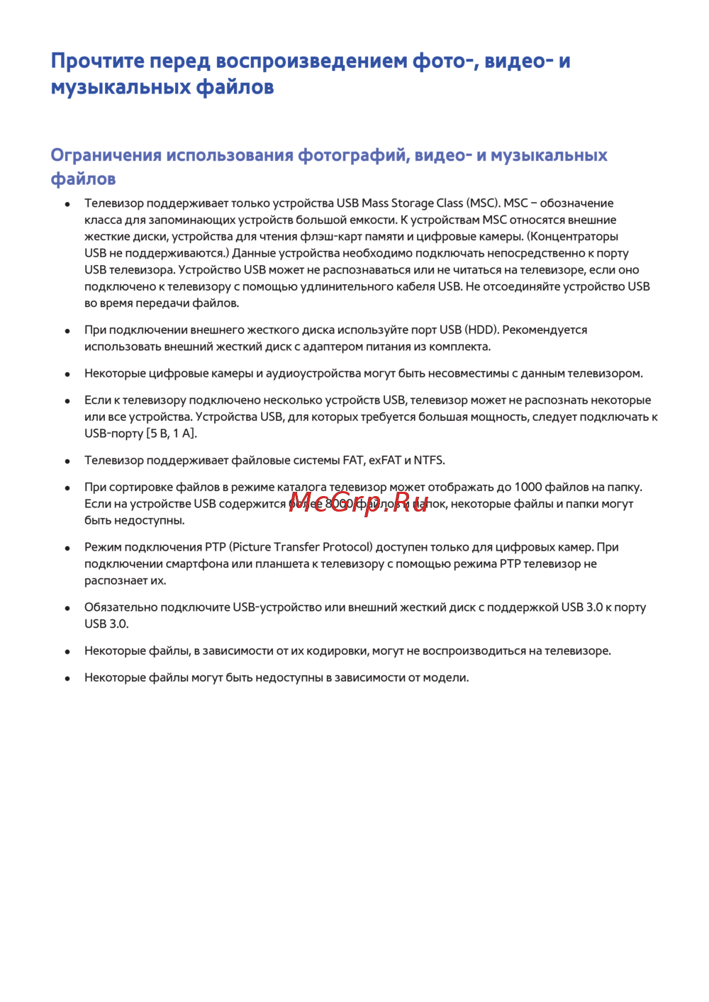 Телевизор поддерживает только устройства USB Mass Storage Class (MSC). MSC – обозначение