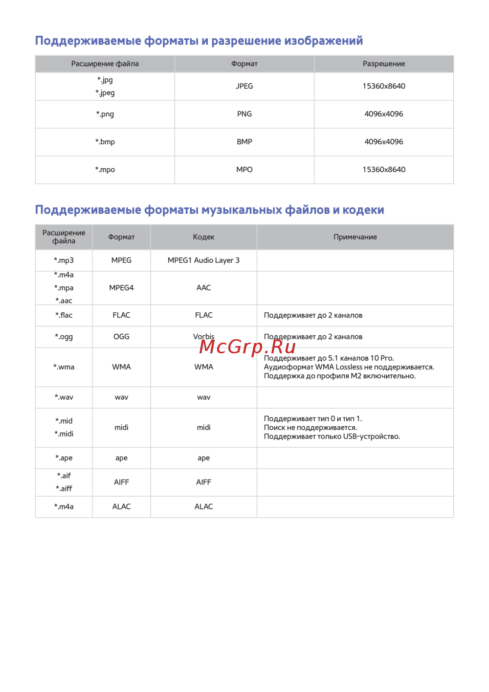 Полный список поддерживаемых форматов изображений (JPEG, PNG, BMP, MPO) и музыкальных файлов (MP3, AAC, FLAC, WAV и другие). Узнайте о разрешениях и кодеках.