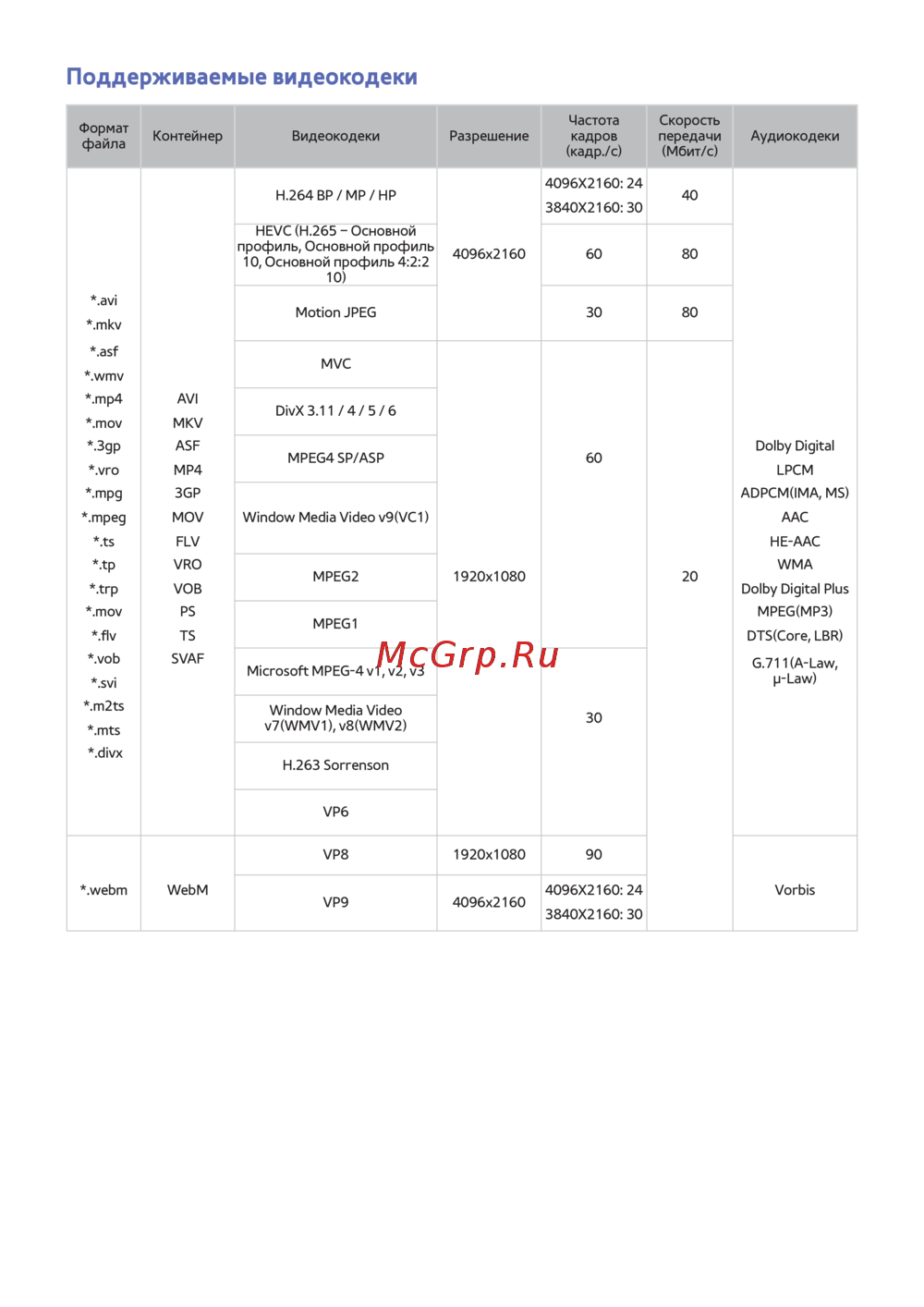 - Поддерживаемые видеокодеки p.182