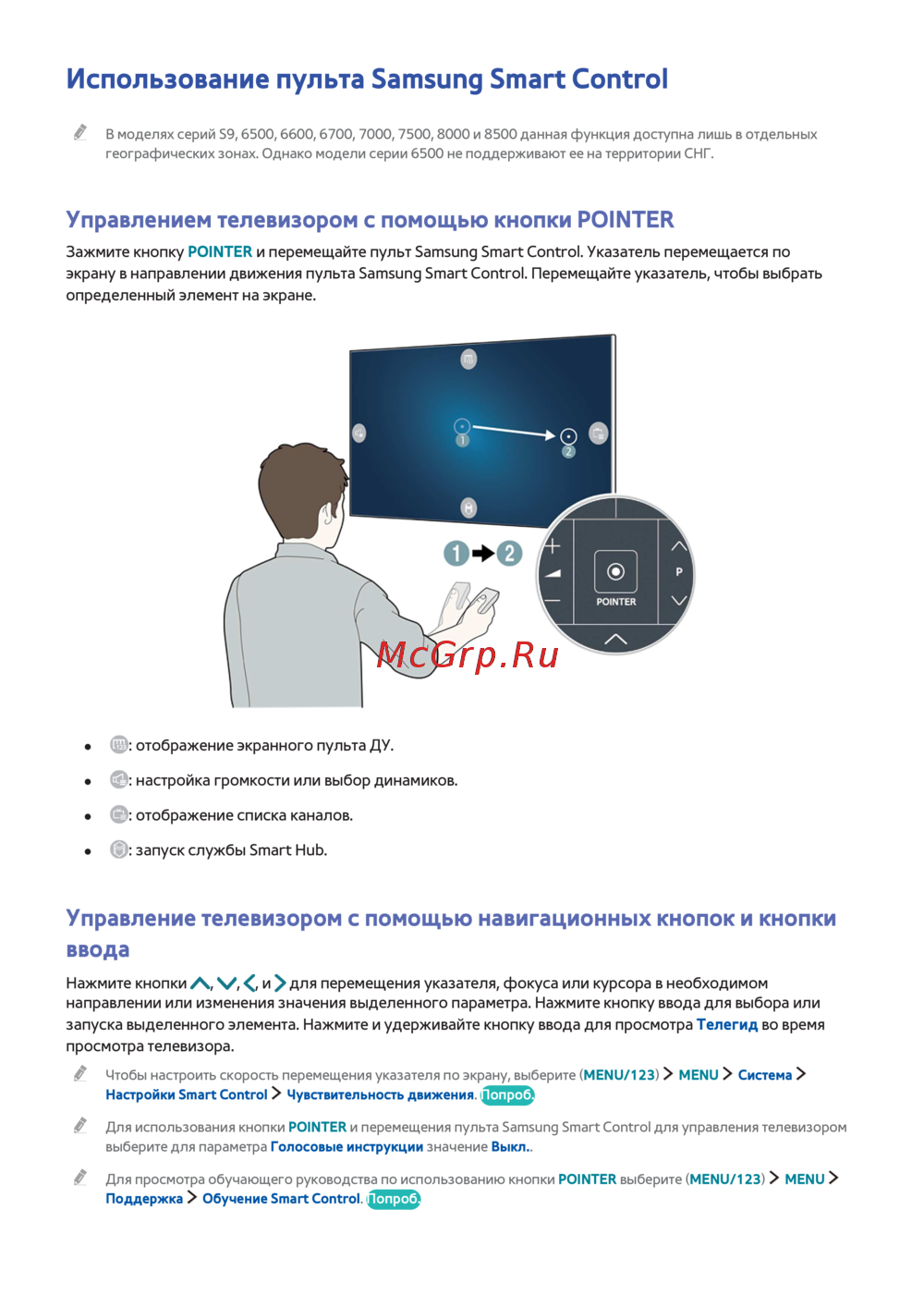 Зажмите кнопку POINTER и перемещайте пульт Samsung Smart Control. Указатель перемещается по