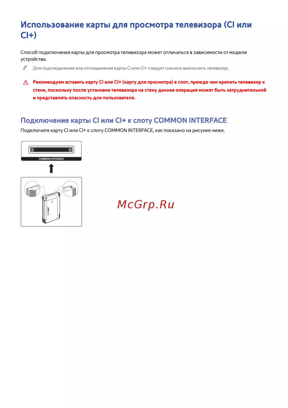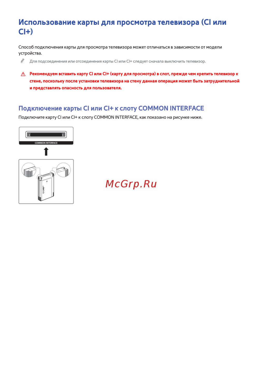 Рекомендуем вставить карту CI или CI+ (карту для просмотра) в слот, прежде чем крепить телевизор к