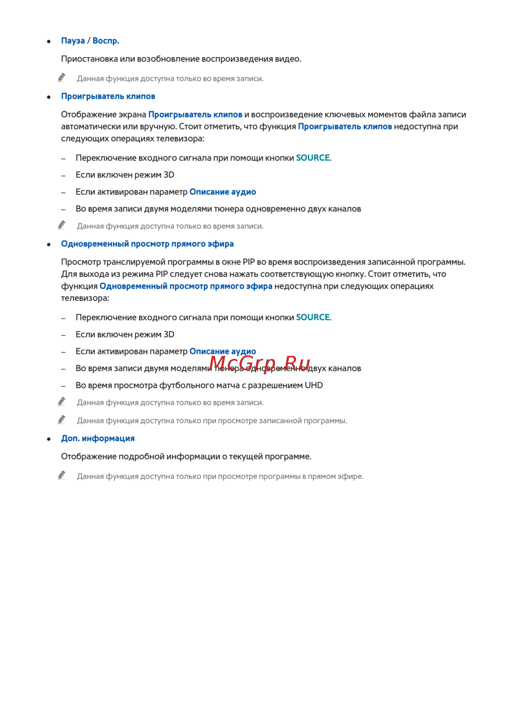 Узнайте о возможностях паузы, проигрывателя клипов и одновременного просмотра эфира на телевизоре. Подробности о доступных функциях и ограничениях.