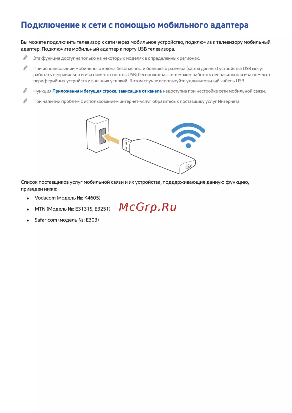 адаптер. Подключите мобильный адаптер к порту USB телевизора.