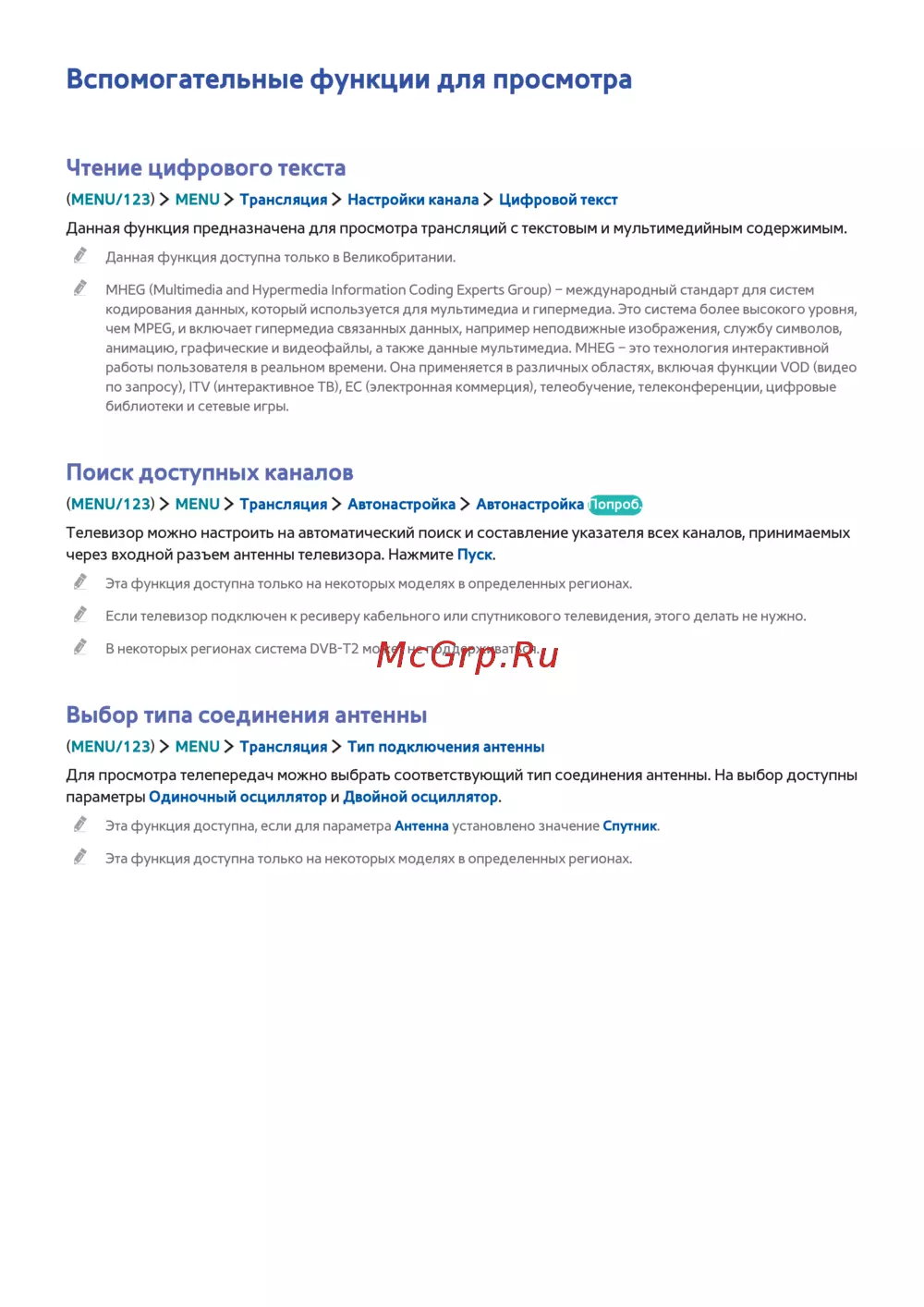 Узнайте о функциях просмотра цифрового текста и настройках антенны для оптимального приема телепередач. Подробности о MHEG и автоматической настройке.