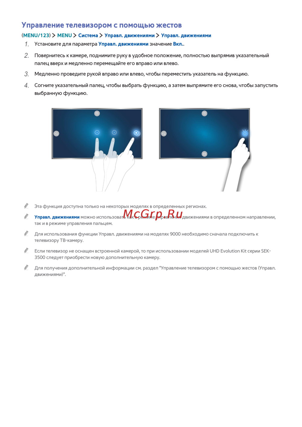 Для получения дополнительной информации см. раздел "Управление телевизором с помощью жестов (Управл.