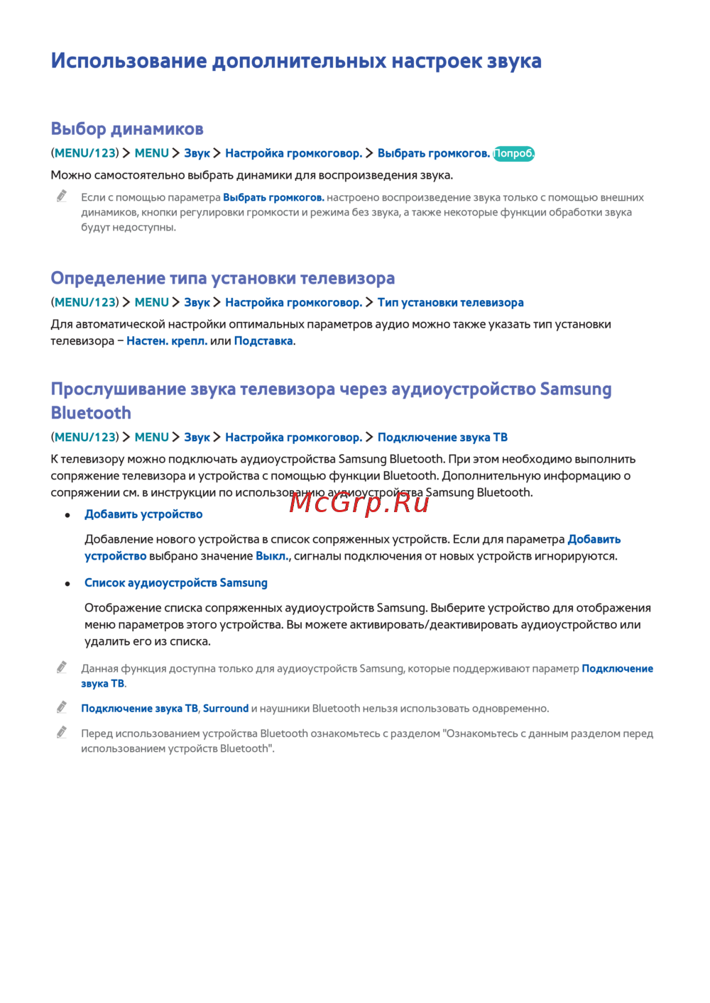 К телевизору можно подключать аудиоустройства Samsung Bluetooth. При этом необходимо выполнить