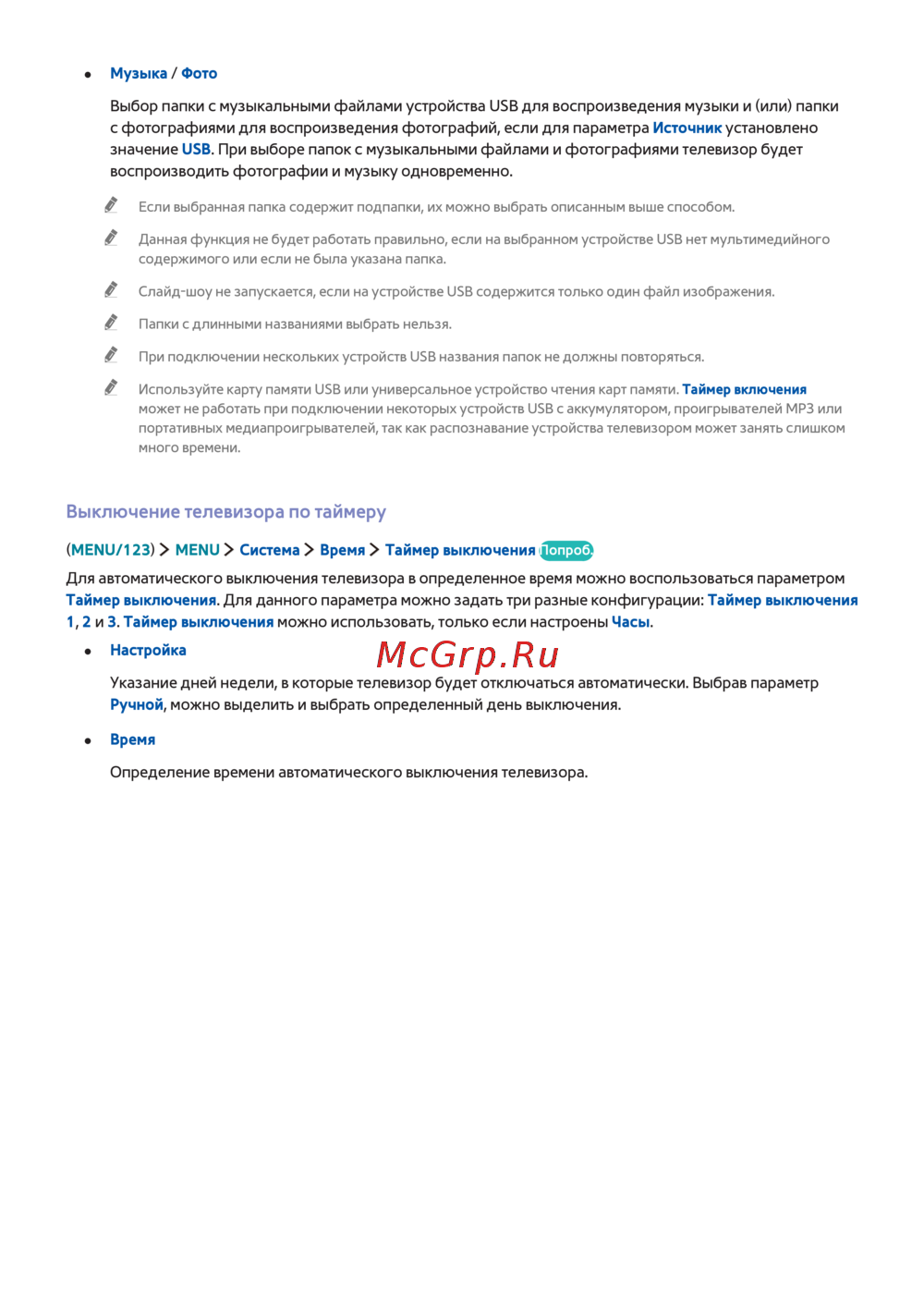 Узнайте, как правильно настроить воспроизведение музыки и фотографий с USB-устройств на телевизоре. Настройте таймер выключения и выберите дни для автоматического отключения.