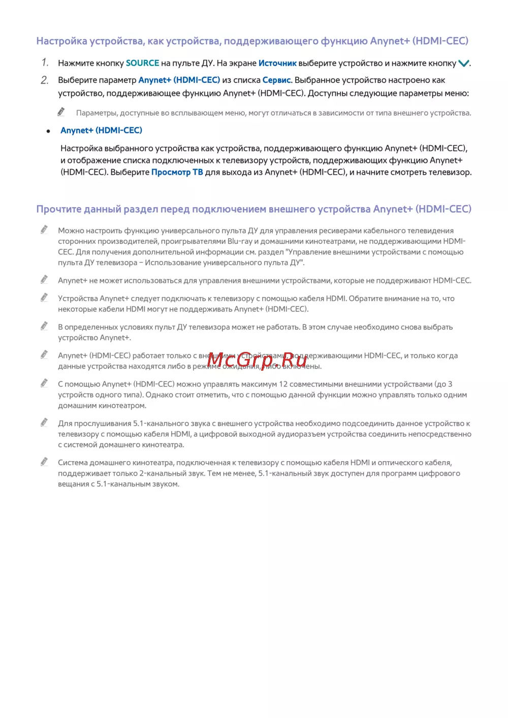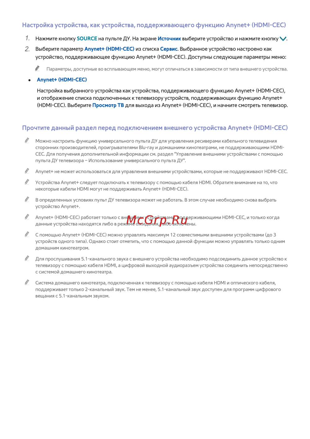 Anynet+ (HDMI-CEC) работает только с внешними устройствами, поддерживающими HDMI-CEC, и только когда