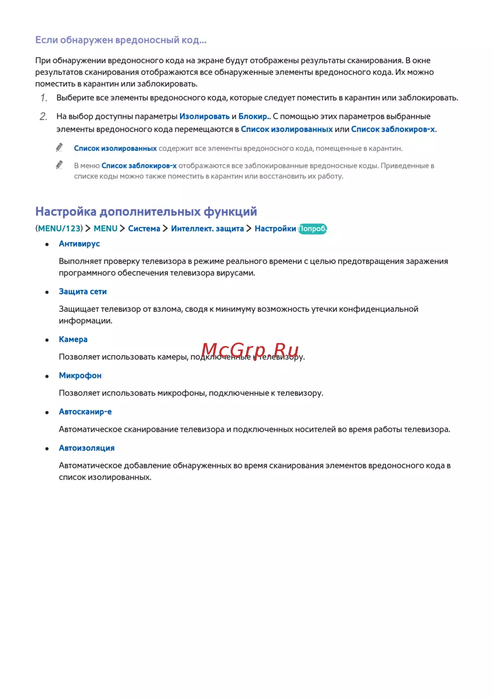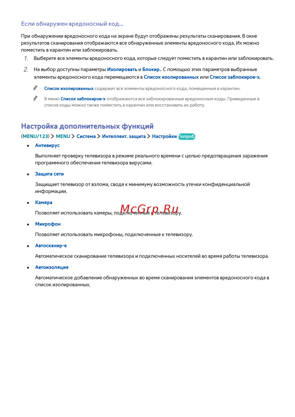 Узнайте, как обнаружить и управлять вредоносным кодом на вашем телевизоре. Поместите вредоносные элементы в карантин или заблокируйте их для защиты устройства.