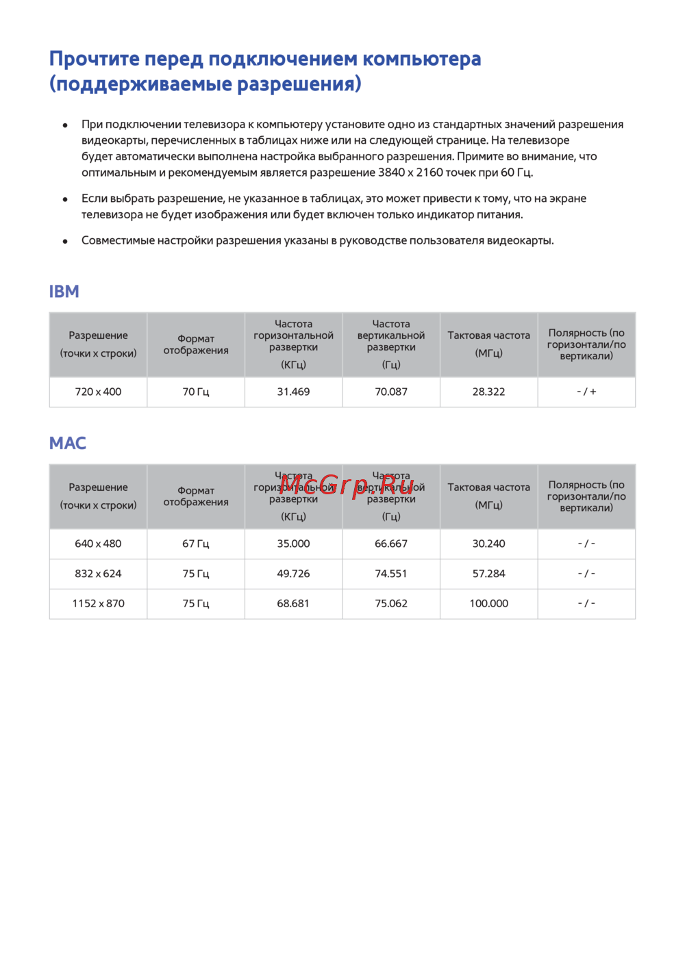 - При подключении телевизора к компьютеру установите одно из стандартных значений разрешения видеокарты перечисленных в таблицах ниже или на следующей странице на телевизоре будет автоматически выполнена настройка выбранного разрешения примите во внимание что оптимальным и рекомендуемым является разрешение 3840 x 2160 точек при 60 гц p.187