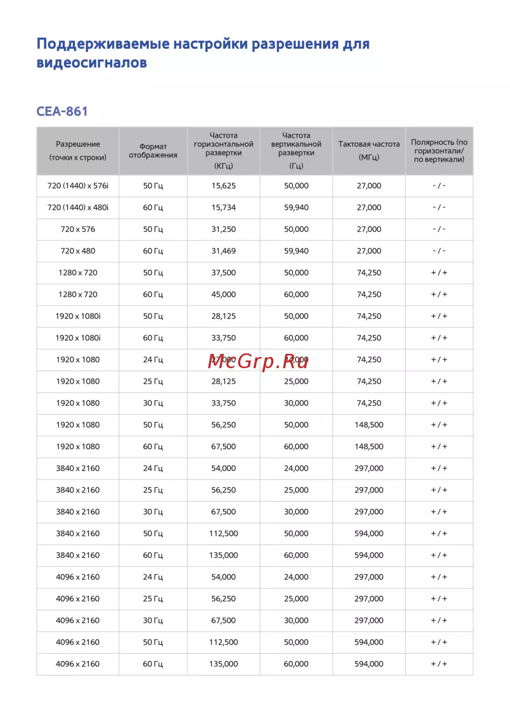 3840 х 2160 24 Гц 54,000 24,000 297,000 + / +