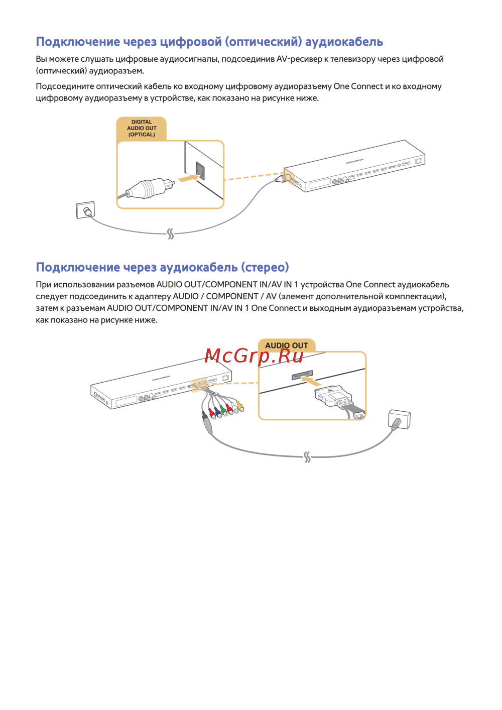 затем к разъемам AUDIO OUT/COMPONENT IN/AV IN 1 One Connect и выходным аудиоразъемам устройства,
