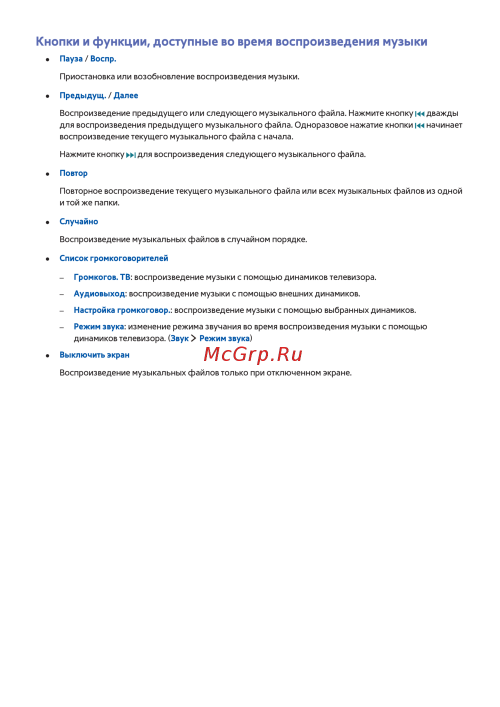 Кнопки и функции, доступные во время воспроизведения музыки