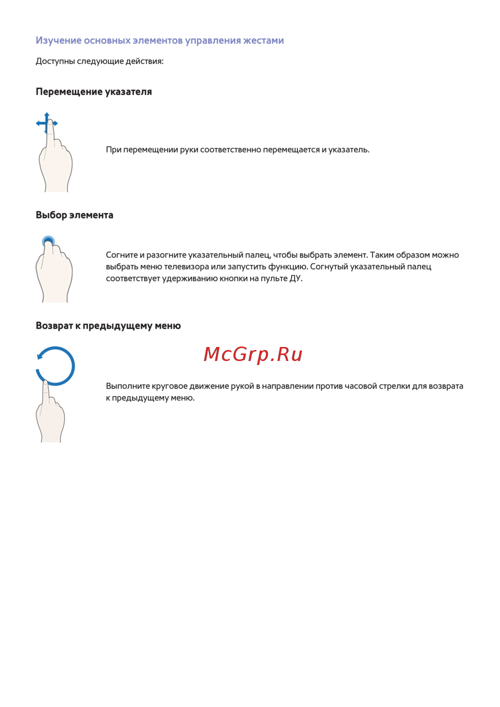 Узнайте, как управлять устройствами с помощью жестов. Перемещение указателя, выбор элементов и возврат к меню — все это доступно с помощью простых движений.