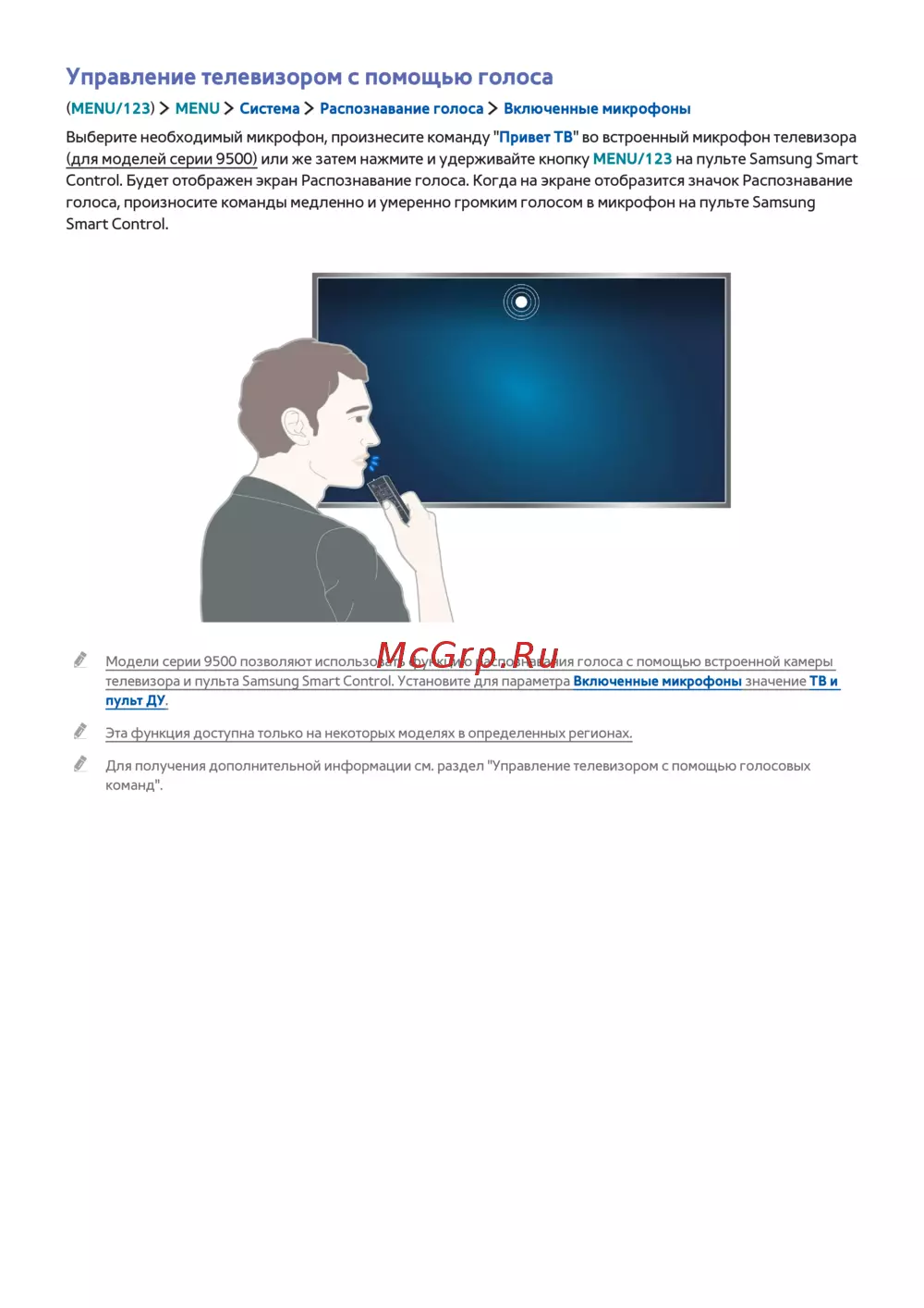 голоса, произносите команды медленно и умеренно громким голосом в микрофон на пульте Samsung