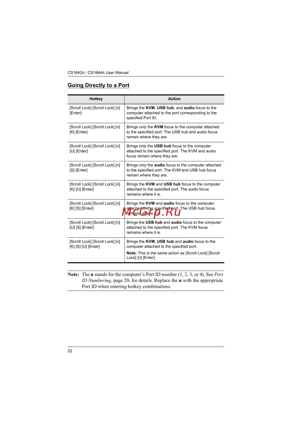 - Note the n stands for the computer s port id number 1 2 3 or 4 see port id numbering page 20 for details replace the n with the appropriate port id when entering hotkey combinations p.30