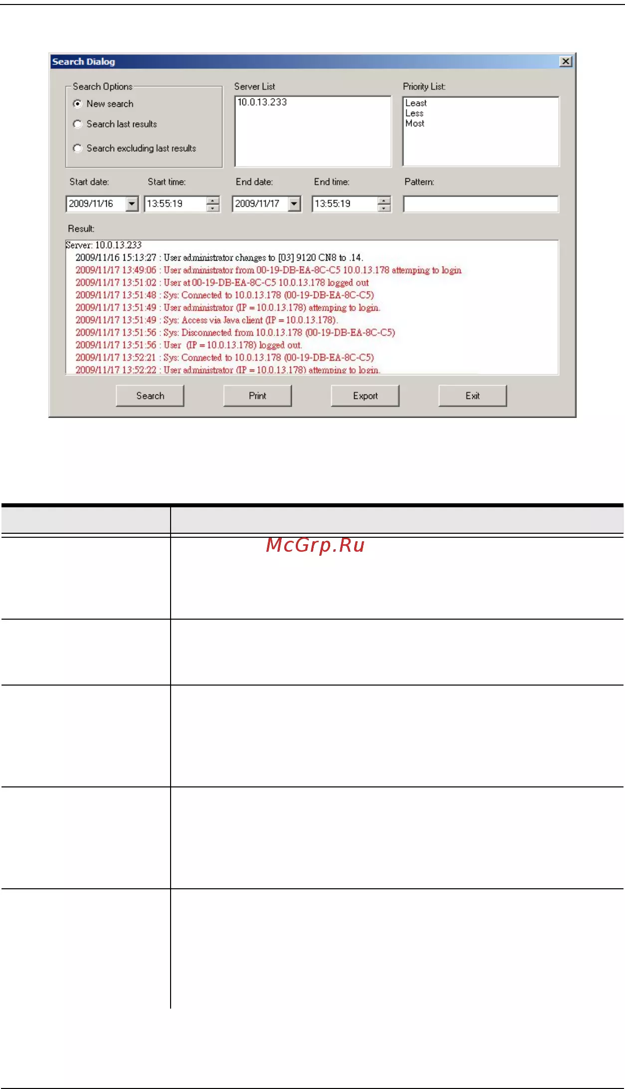 Results (Результаты) Выводится список событий, соответствующих параметрам