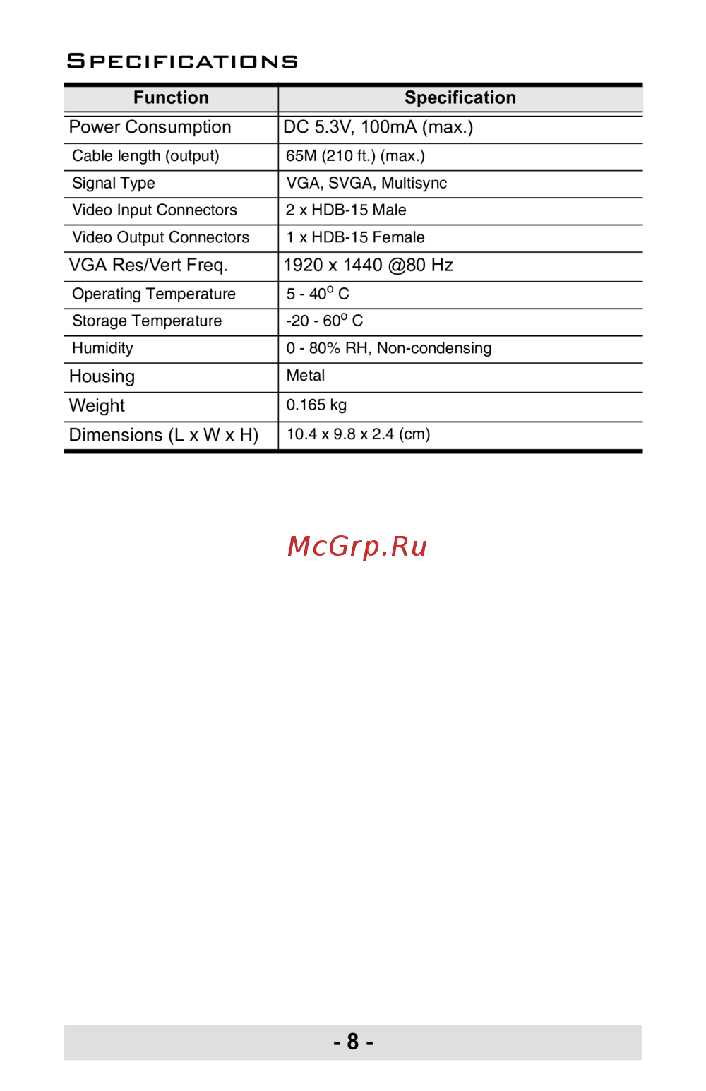 - Power consumption dc 5 v 100ma max p.8