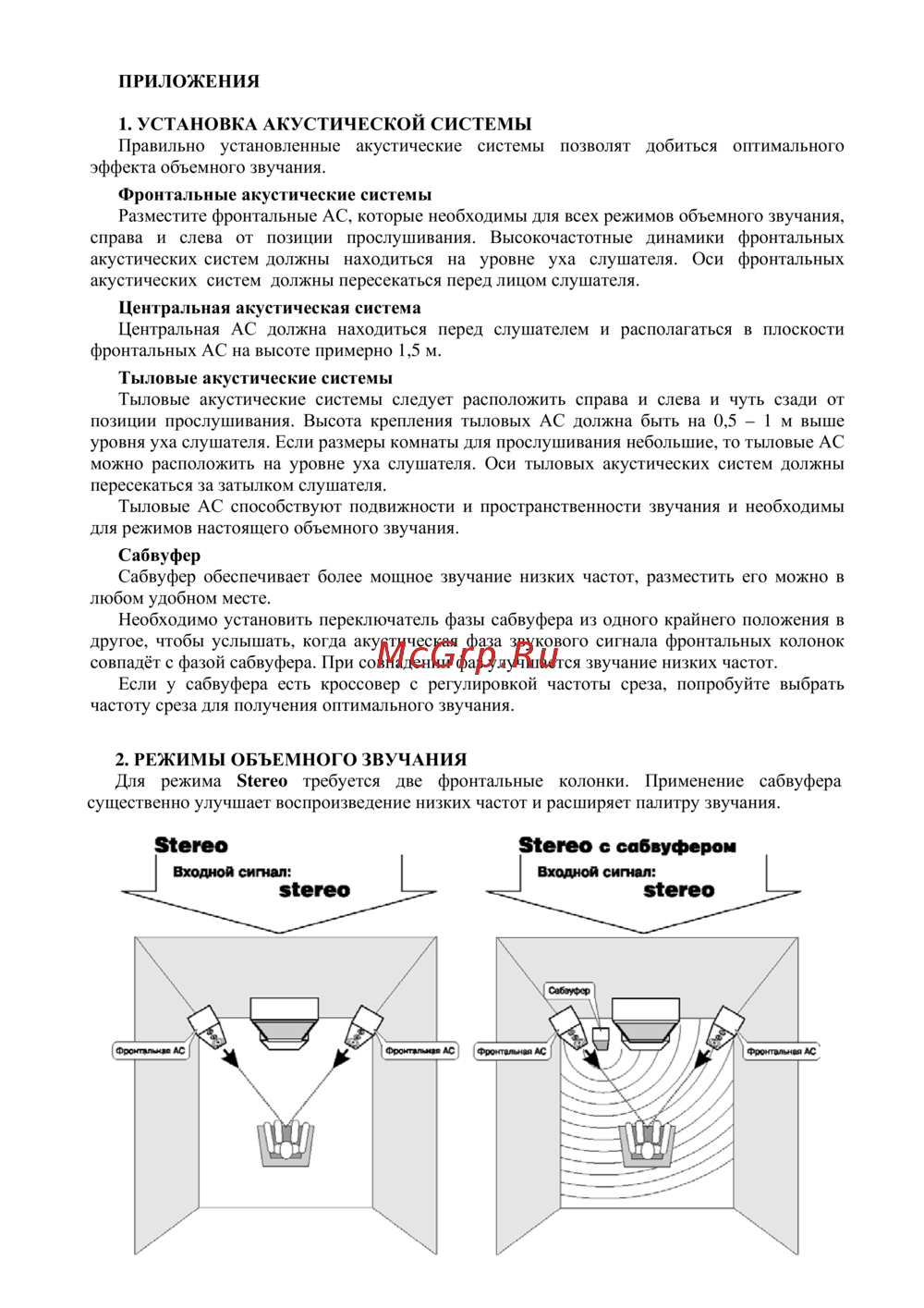 Для режима Stereo требуется две фронтальные колонки. Применение сабвуфера