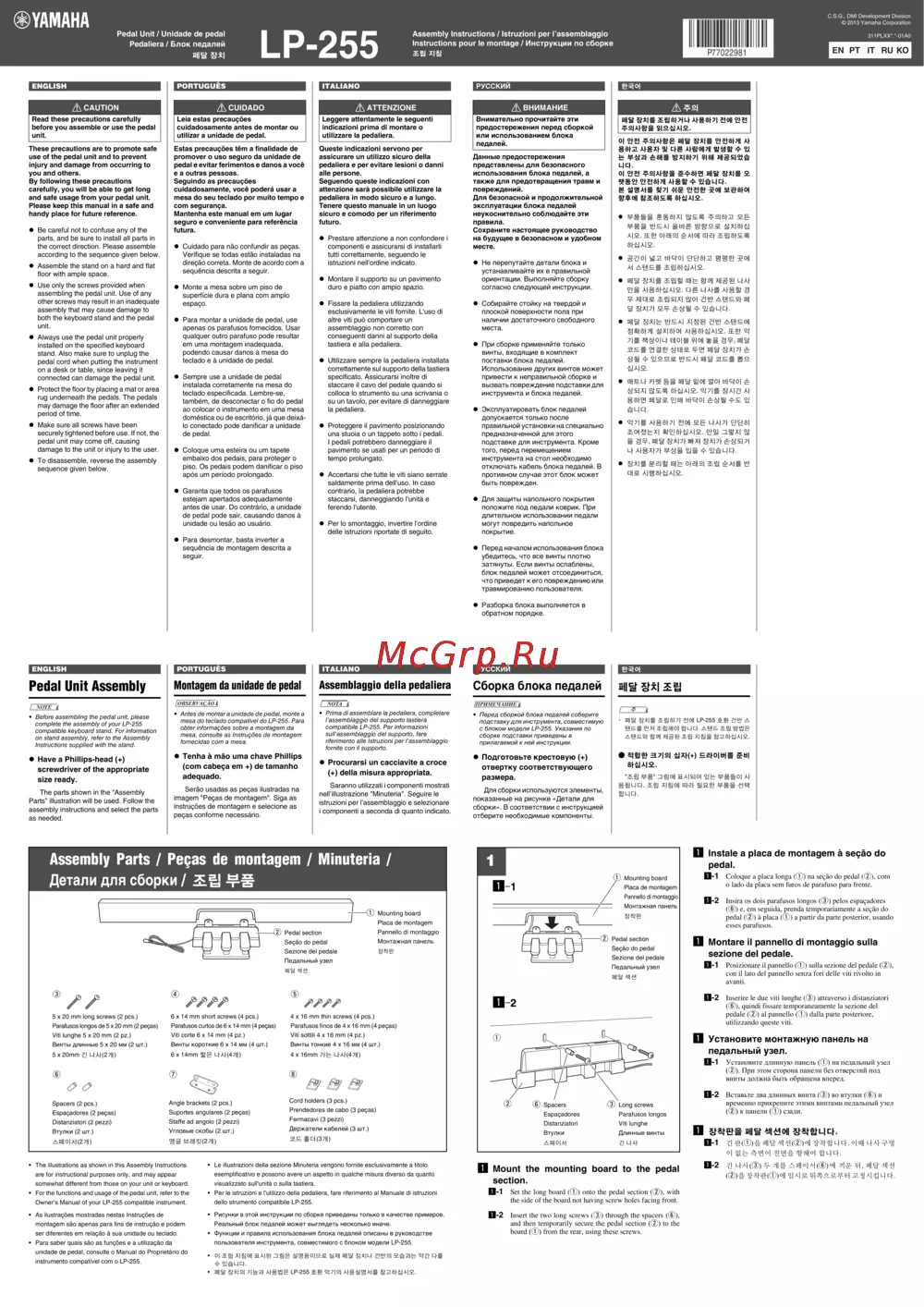 - При сборке применяйте только винты входящие в комплект поставки блока педалей использование других винтов может привести к неправильной сборке и вызвать повреждение подставки для инструмента и блока педалей p.1