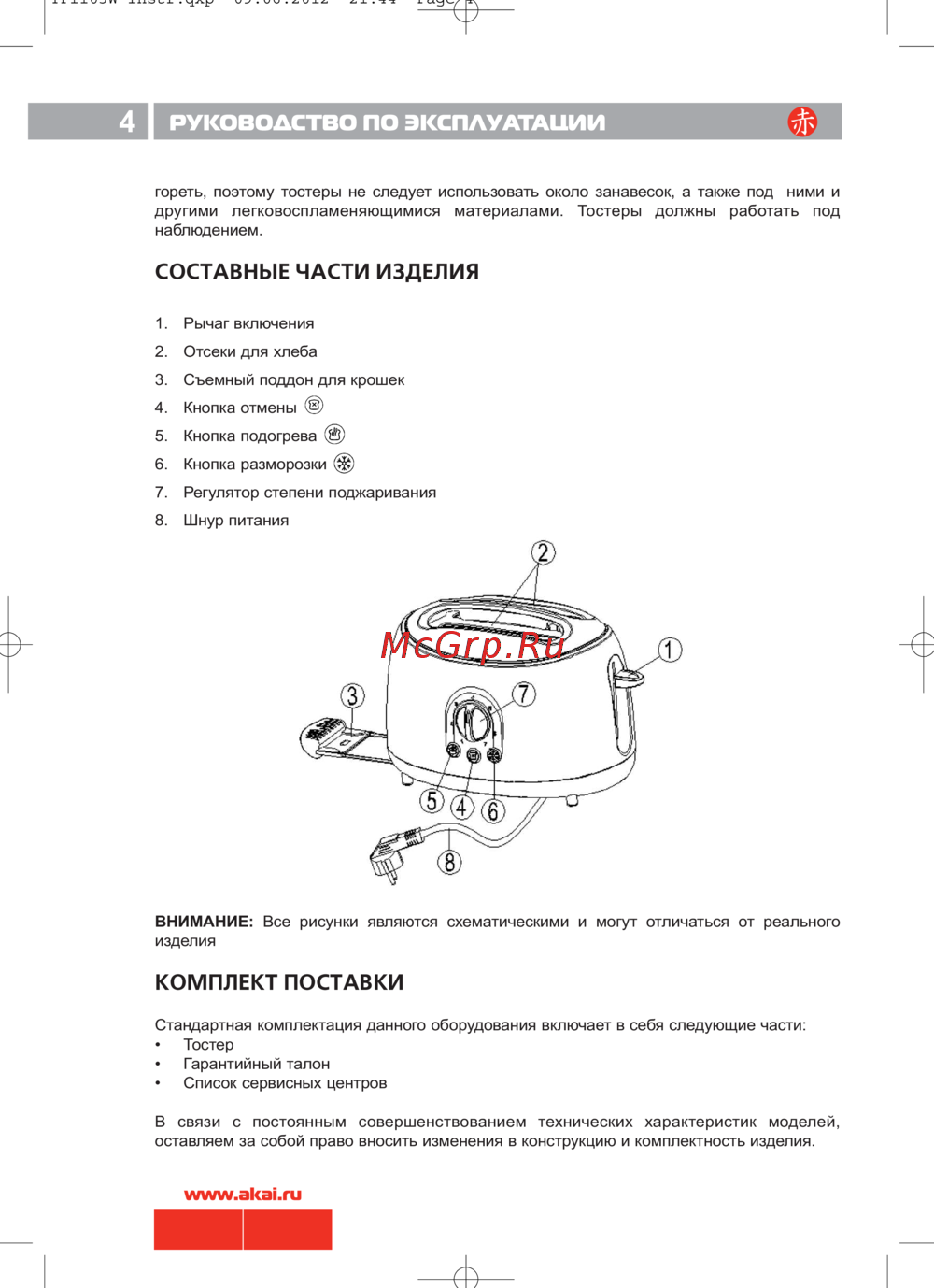 Akai TP-1103W — руководство по эксплуатации тостера: безопасность и функции [4/8]