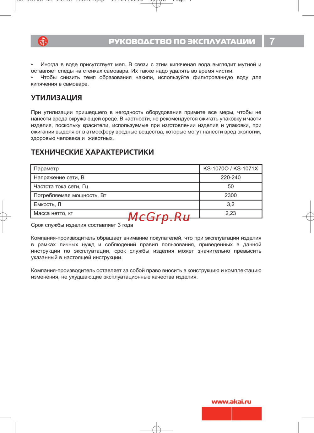 Akai КS-1071X — руководство по эксплуатации и утилизации самовара [7/8]