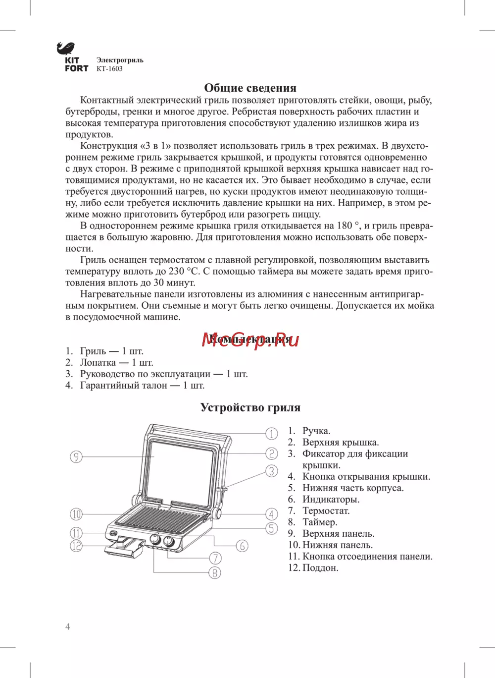 KIT FORT Электрогриль КТ 1603 Общие сведения Контактный электрический гриль позволяет приготовлять стейки овощи рыбу бутерброды гренки и многое другое Ребристая поверхность рабочих пластин и высокая температура приготовления способствуют удалению излишков жира из продуктов Конструкция 3 в 1 позволяет использовать гриль в трех режимах В двухсто роннем режиме гриль закрывается крышкой и продукты готовятся одновременно с двух сторон В режиме с приподнятой крышкой верхняя крышка нависает над го товящимися продуктами но не касается их Это бывает необходимо в случае если требуется двусторонний нагрев но куски продуктов имеют неодинаковую толщи ну либо если требуется исключить давление крышки на них Например в этом ре жиме можно приготовить бутерброд или разогреть пиццу В одностороннем режиме крышка гриля откидывается на 180 и гриль превра щается в большую жаровню Для приготовления можно использовать обе поверх ности Гриль оснащен термостатом с плавной регулировкой позволяющим выставить температуру вплоть до 230 C С помощью таймера вы можете задать время приго товления вплоть до 30 минут Нагревательные панели изготовлены из алюминия с нанесенным антипригар ным покрытием Они съемные и могут быть легко очищены Допускается их мойка в посудомоечной машине Комплектация 1 Гриль 1 шт 2 Лопатка 1 шт 3 Руководство по эксплуатации 1 шт 4 Гарантийный талон 1 шт Устройство гриля 1 Ручка 2 Верхняя крышка 3 Фиксатор для фиксации крышки 4 Кнопка открывания крышки 5 Нижняя часть корпуса 6 Индикаторы 7 Термостат 8 Таймер 9 Верхняя панель 10 Нижняя панель 11 Кнопка отсоединения панели 12 Поддон 4