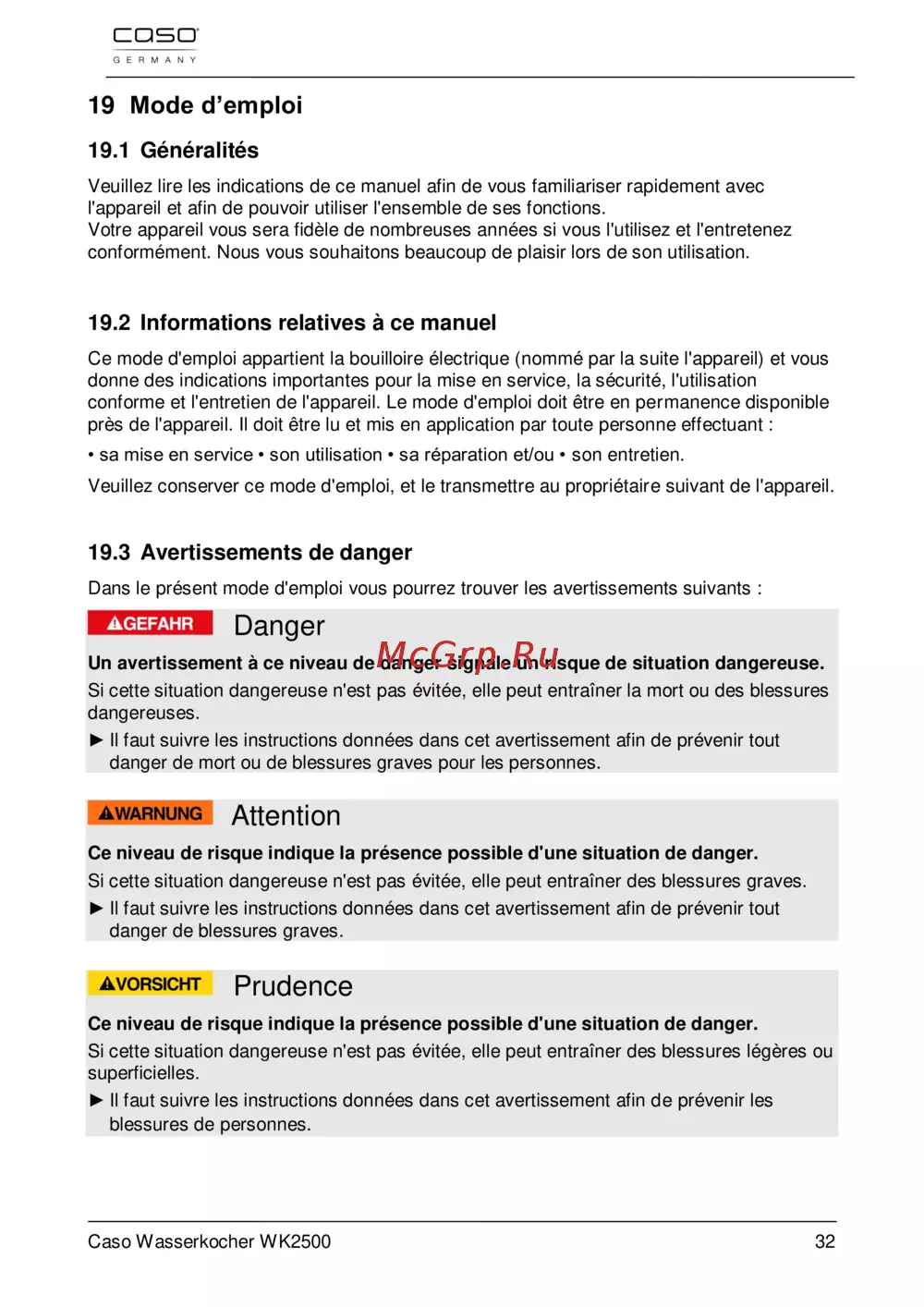 Caso wk 2500 — guide d'utilisation de la bouilloire électrique : sécurité et entretien [32/78]