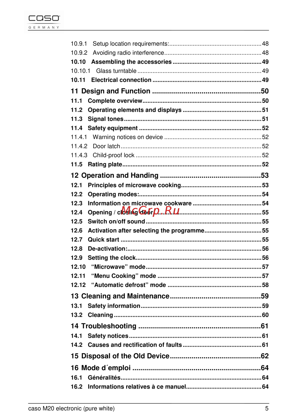 Caso m 20 electronic pure white — полное руководство по настройке и эксплуатации микроволновой печи [5/168]