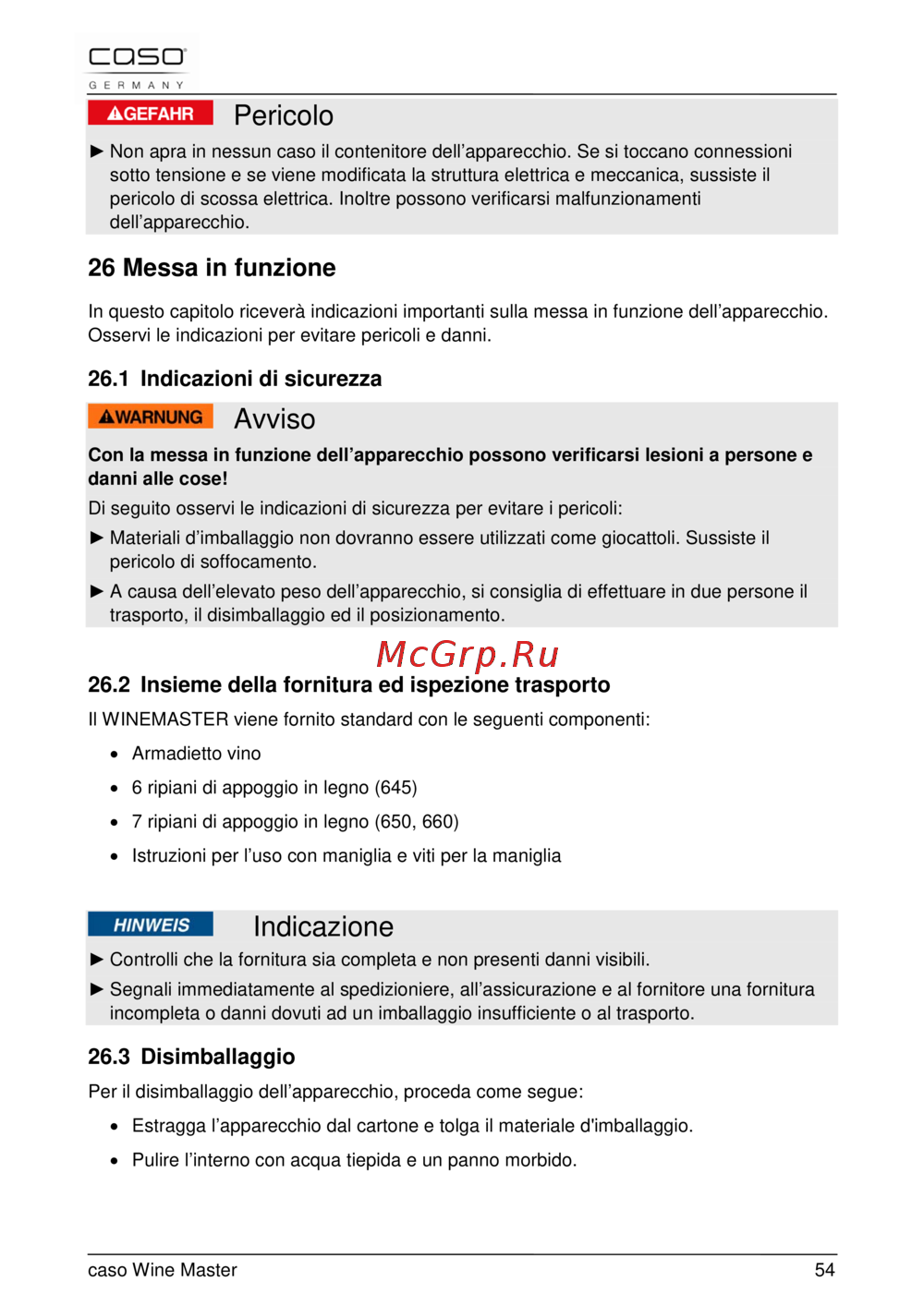 Caso winemaster 24 — guida alla Sicurezza e Messa in Funzione dell'Apparecchio [54/90]