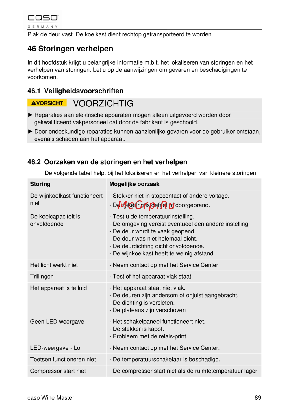 Caso winemaster 24 — informatie over het oplossen van storingen in wijnkoelkasten [89/90]
