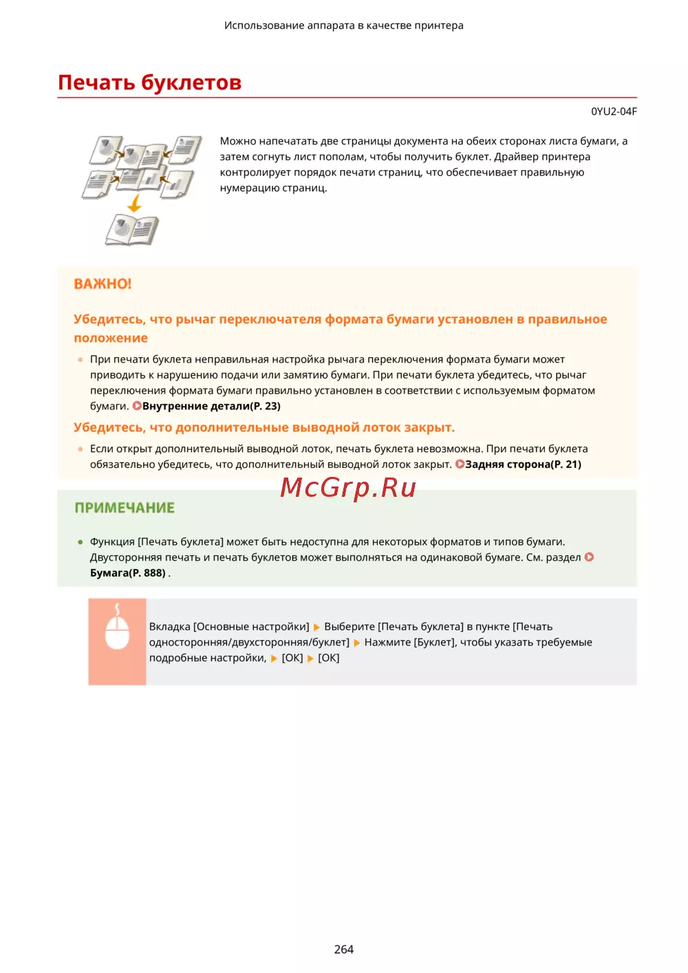 ● Если открыт дополнительный выводной лоток, печать буклета невозможна. При печати буклета