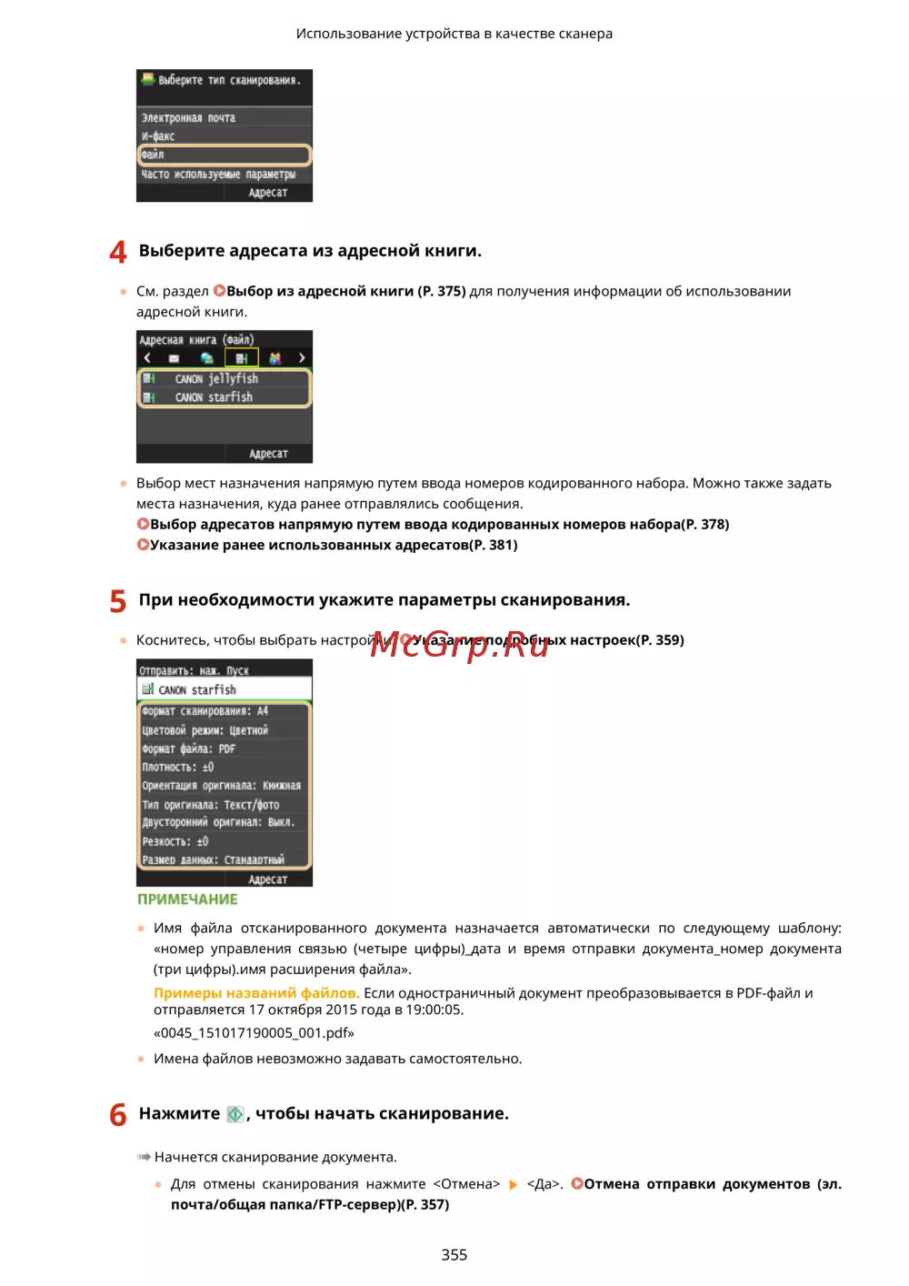 Узнайте, как выбрать адресата из адресной книги и настроить параметры сканирования документов. Пошаговые инструкции и примеры названий файлов.