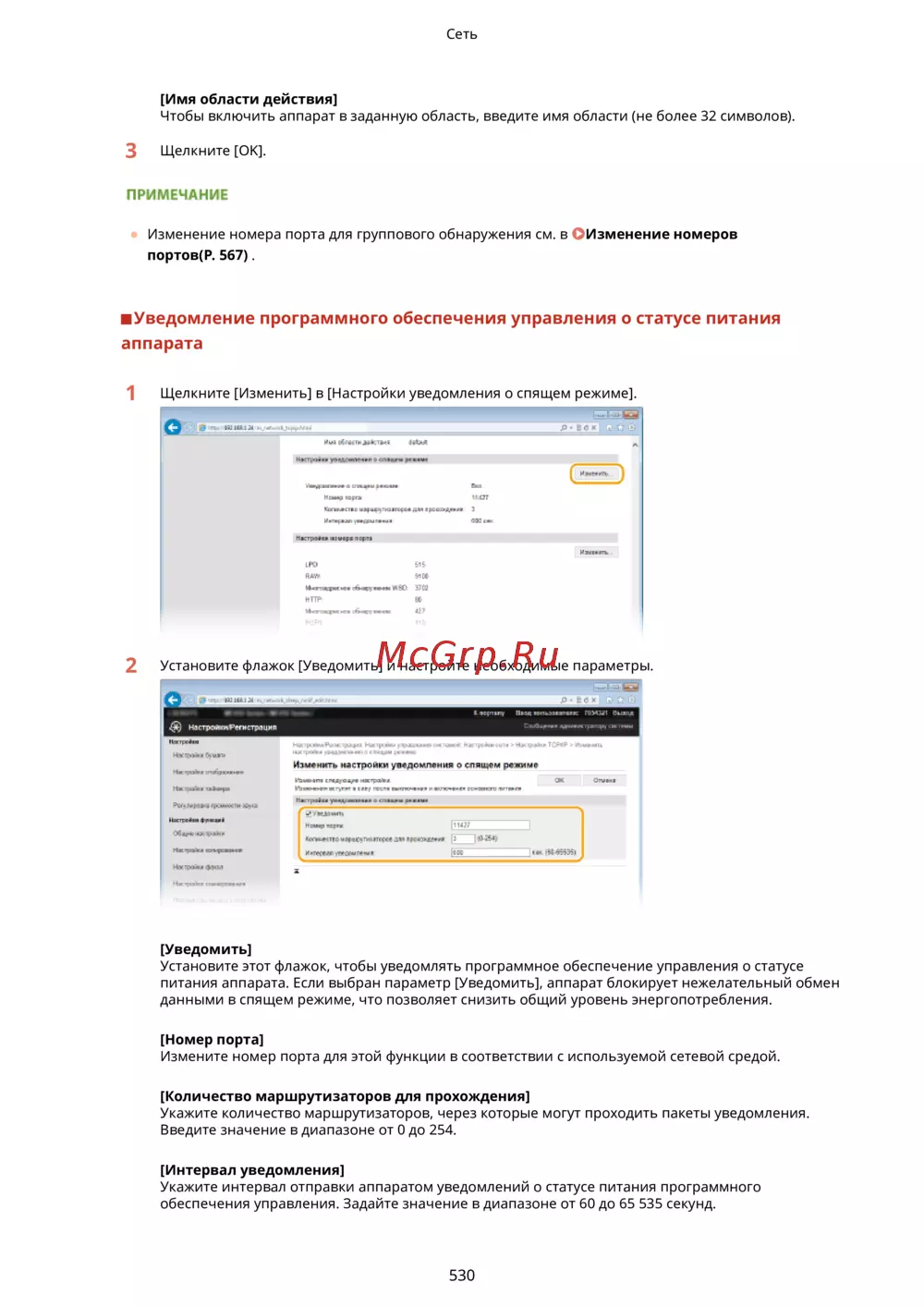 Узнайте, как настроить уведомления о статусе питания аппарата и изменить номера портов для группового обнаружения. Оптимизируйте энергопотребление и настройте параметры сети.