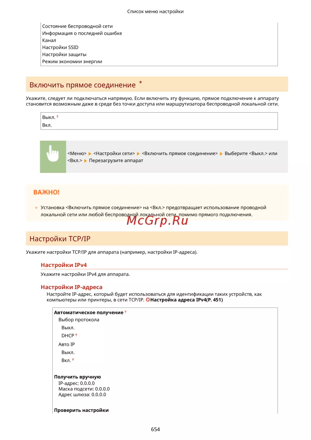 Узнайте, как настроить беспроводную сеть и параметры TCP/IP для ваших устройств. Получите информацию о прямом подключении и настройках IP-адреса.