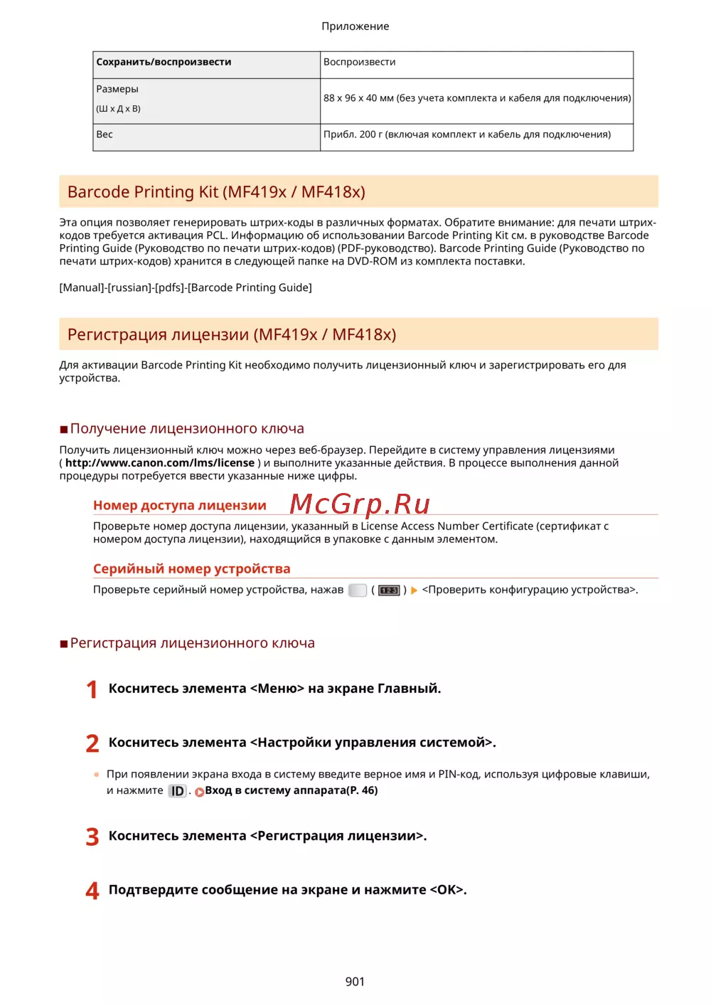 Canon i-sensys mf418x — информация о печати штрих-кодов и регистрации лицензии [911/949]